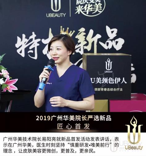 广州华美皮肤科【技术院长易阳亮】在新品发布致辞中表示,广州华美皮肤科跟随着品牌一起发展壮大,拥有25年发展历史,在皮肤医美技术的研磨上,一直有着严苛的高要求,成立至今坚持把皮肤治疗效果放在首位,在建立医师和顾客详细的沟通机制的基础上,倡导美肤的综合治疗方案,以确保很好的美肤效果;五行除斑术、U美龄、颈色伊人三大新品是广州华美皮肤科25年来潜心研究的结果。她相信,这三大技术必将给广州市民带来更好的美肌蜕变。